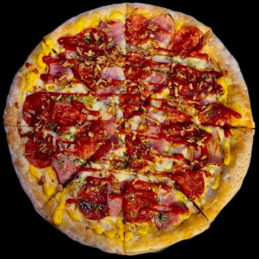 Основа: сырная. Сыр моцарелла, пепперони, бекон, криспи лук, соус сладкий чили, базилик.