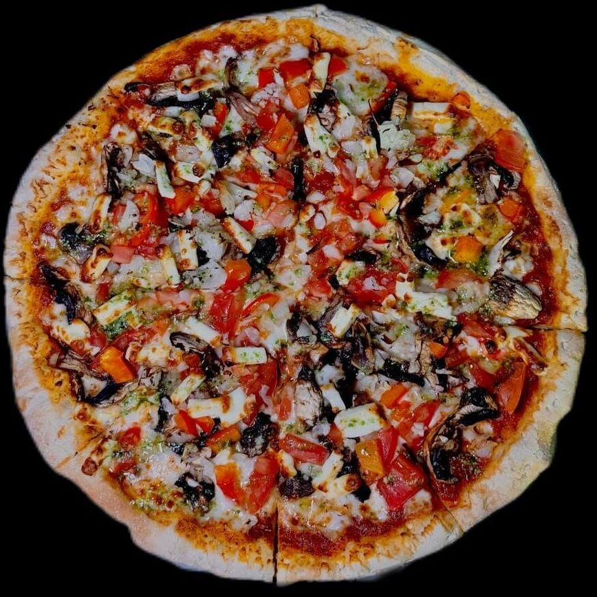 Основа: томатная. Сыр моцарелла, сыр фета, грибы, красный лук, сладкий перец, помидор, базилик.