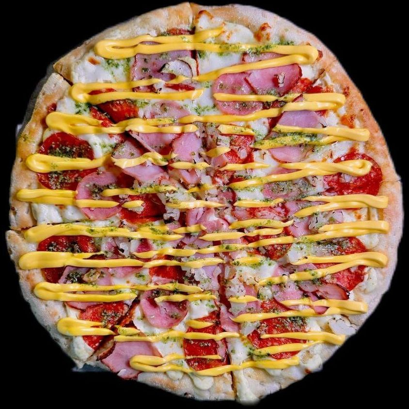 Основа: чесночная. Сыр моцарелла, пепперони, ветчина, бекон, грибы, красный лук, соус сырный, базилик.