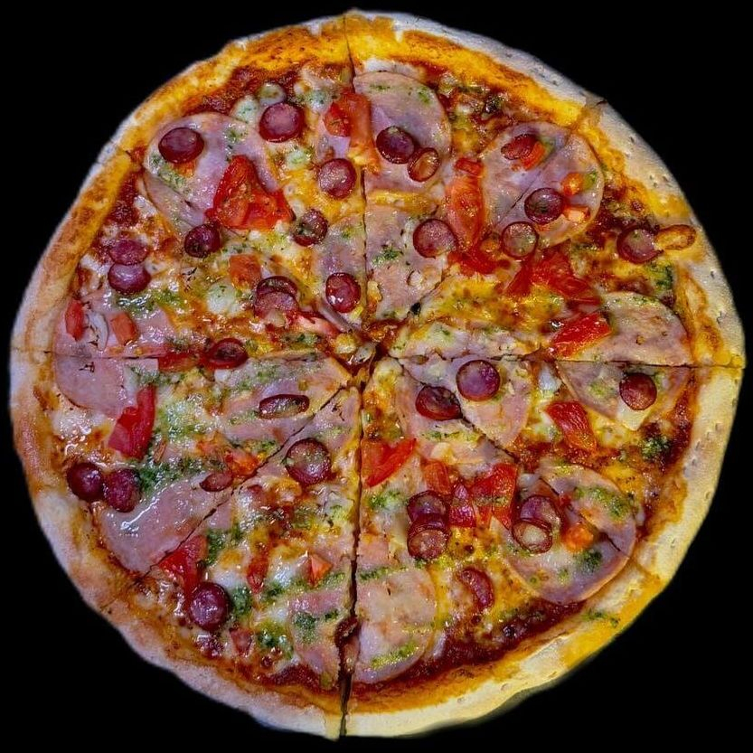 Основа: чесночная. Сыр моцарелла, пепперони, ветчина, бекон, красный лук, перец сладкий, помидор, соус гриль, базилик.