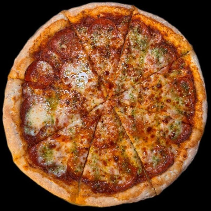 Основа: чесночная. Сыр моцарелла, пепперони, ветчина, бекон, красный лук, перец сладкий, помидор, соус гриль, базилик.