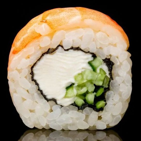 Рис, нори, сыр Филадельфия, креветка, огурец, стружка тунца.