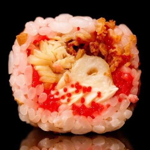 Рис, нори, сыр Филадельфия, угорь, креветка, икра летучей рыбы, соус унаги, криспи лук.
