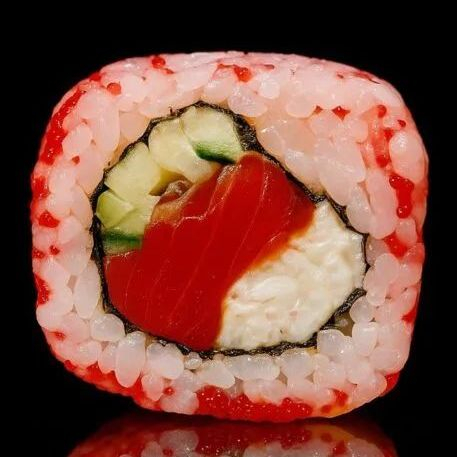 Рис, нори, икра летучей рыбы, японский майонез, огурец, лосось, креветка.