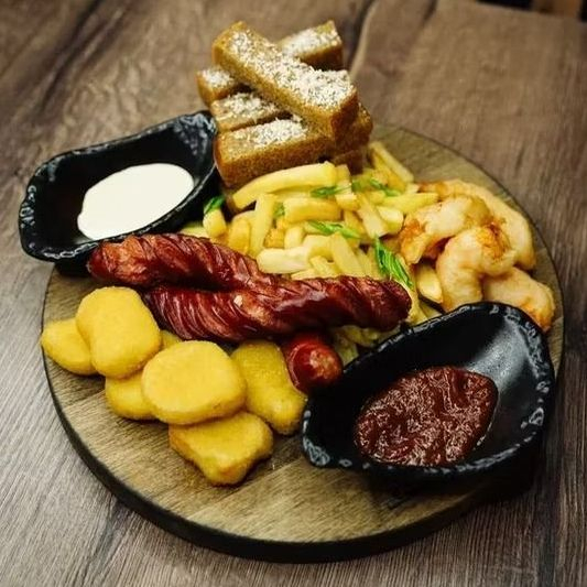 Картофель фри, хлеб, колбаски, креветки в панировке, наггетсы, соус барбекю, соус чесночный.