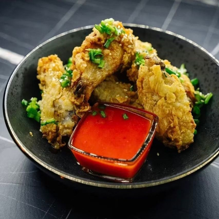 Крылышки, джем чили, зеленый лук.