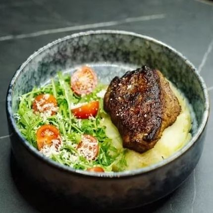 Нежнейшая телятина, картофельное пюре, черри, чеснок, руккола, соево-медовая заправка, пармезан.