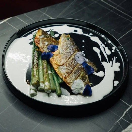 Сибас, спаржа, бекон, сливки.