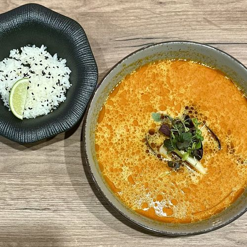 Бульон том ям, кокосовое молоко, мидии, кальмар, креветки, грибы, черри, рис.