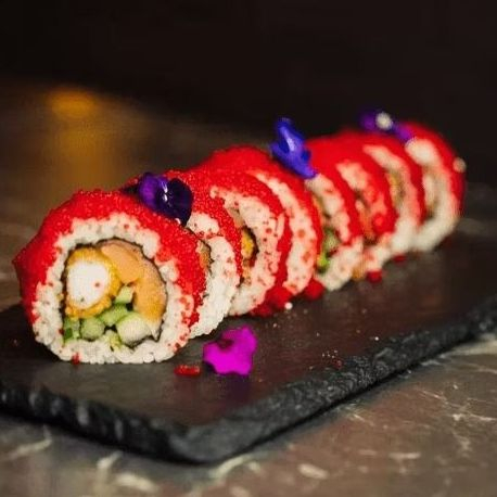 Рис, нори, креветка темпура, форель, огурец, икра масаго, цедра апельсина, свит чили.