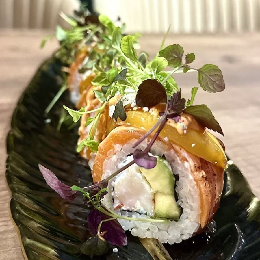 Рис, нори, крем чиз, креветка, форель, персик, дор блю, авокадо, соус спайси, соус терияки.