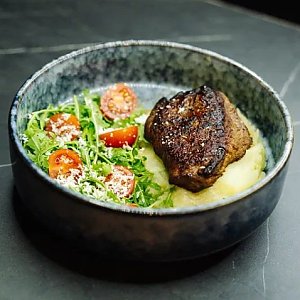 Нежнейшая телятина, картофельное пюре, черри, чеснок, руккола, соево-медовая заправка, пармезан.
