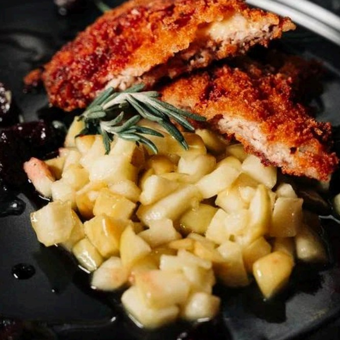 Котлета из утки и цыпленка с клюквой и томленным пряным яблоком.