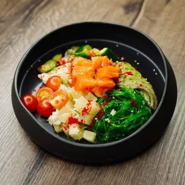 Рис, лосось, огурец, черри, авокадо, чука, такуан, икра тобико, кунжутный соус.