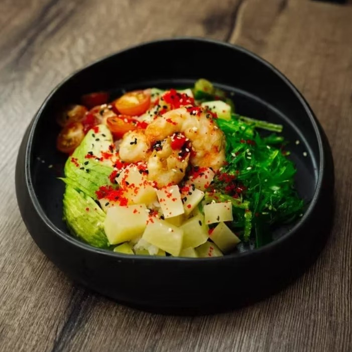 Рис, креветки, чука, огурец, авокадо, черри, такуан, кунжутный соус, соус понзу.