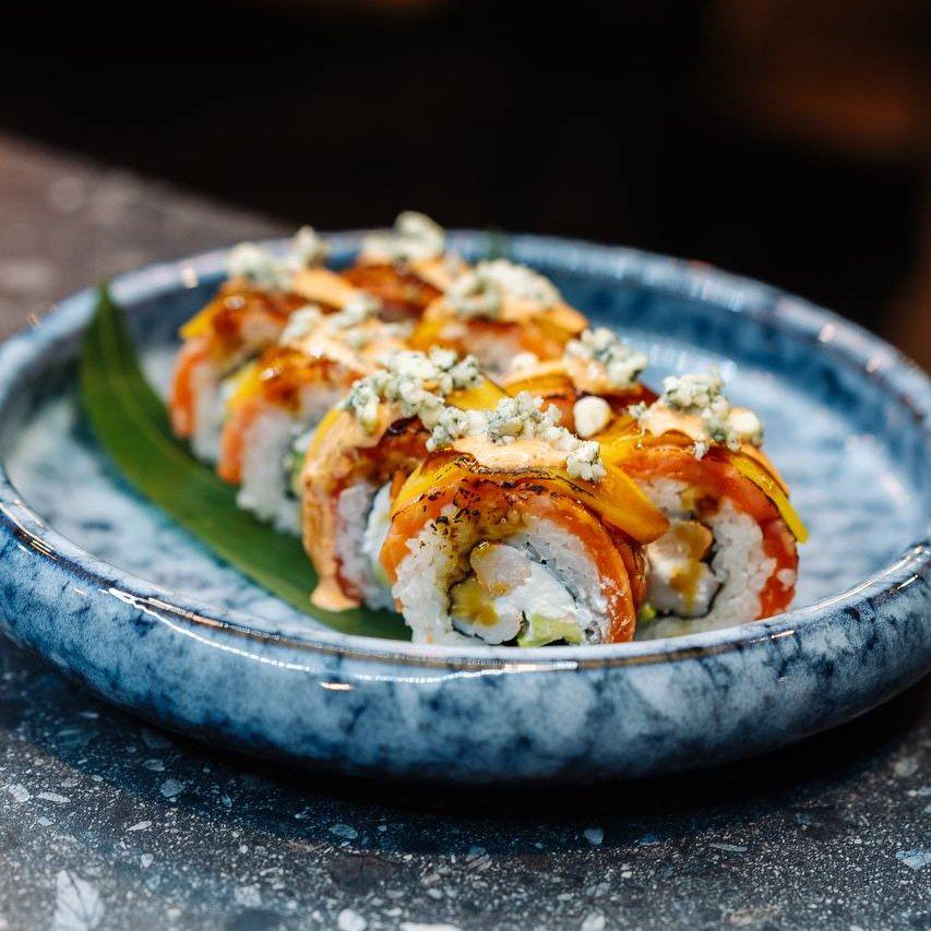 Рис , крем чиз, нори, авокадо, креветки, форель, персик, дор блю , соус спайси, унаги.
