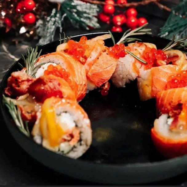 Рис, нори , крем чиз, огурец, лосось, соус для запеченных, мидии, икра тобико.