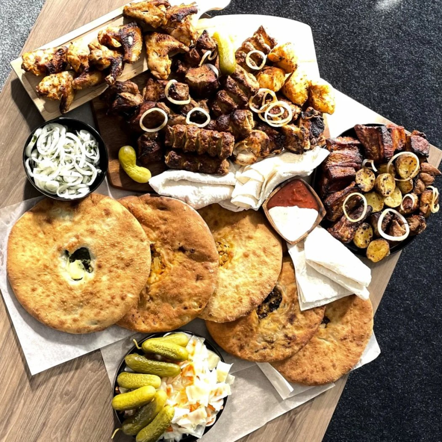Пирог Капричоза (1300г), пирог Карбонара (1300г), пирог с картофелем и беконом (1300г), пирог с яблоком и корицей (1300г), пирог с яблоком и вишней (1300г), куриные бедрышки (500г), куриное филе (500г), куриное крыло (500г), свиной окорок (400г), свиная шея (400г), свиные колбаски (500г), свиные ребра (400г), соус Чесночный (180г), соус Фирменный (180г), лук маринованный (200г), капуста Провансаль (400г), картофель по-деревенски (600г), огурчики маринованные (400г), лаваш 3шт (300г).