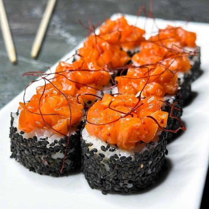 Лосось, огурец, сыр, авокадо, кунжут, нори, соус терияки.