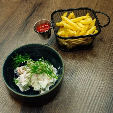 Овощной салат, картофель фри, кетчуп.