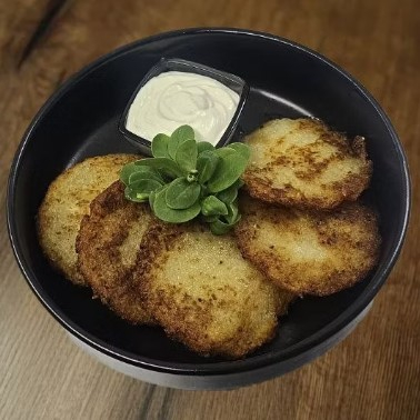 Драники домашние, буженина, соус (сметана, майонез, лимонный сок, чеснок), шампиньоны, сыр, луковые кольца.
