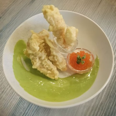 Кальмар темпура, креветка темпура, соус васаби-лайм.