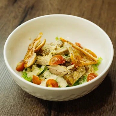 Салат, черри, соус цезарь, мякоть бедра, пармезан, крутоны.