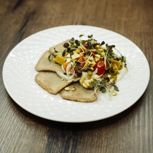 Язык, грибы белые жареные, черри, красный лук, соус на основе хрена.