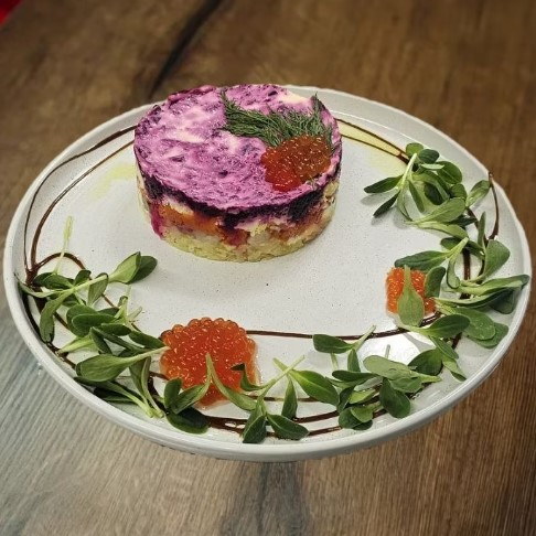 Сельдь, свекла, картофель, морковь, лук, яйцо, майонез, имитация икры.