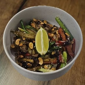 Рис, вырезка говяжья, баклажан, перец сладкий, лук зеленый, орех кешью, кунжут, соус унаги, соус сладкий чили, лайм.