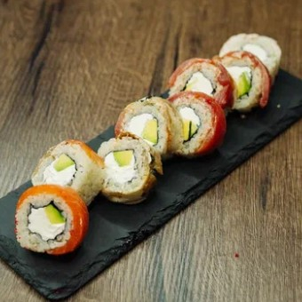 Рис, нори, крем-чиз, салат, огурец, икра масаго, лосось, соус унаги, соус свит чили, соус табаско.