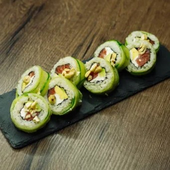 Рис, нори, крем-чиз, салат, огурец, икра масаго, лосось, соус унаги, соус свит чили, соус табаско.