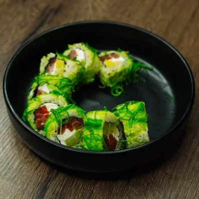 Рис, нори, крем-чиз, салат, огурец, икра масаго, лосось, соус унаги, соус свит чили, соус табаско.