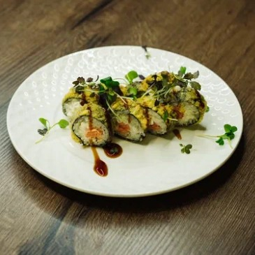 Рис, нори, лосось, крем-чиз, темпура, панко, соус унаги.