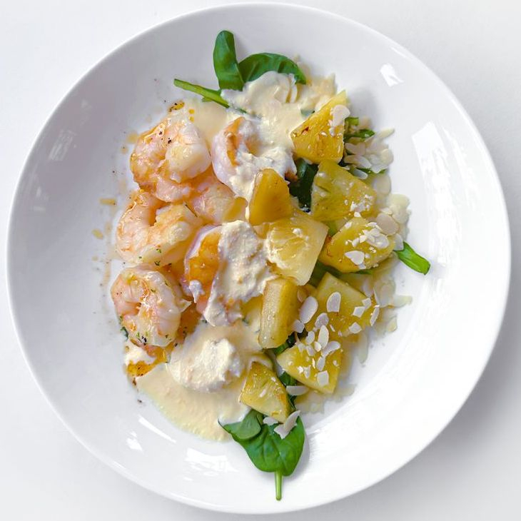 Заказать Креветки, ананас, микс салатов, сливочный соус, масло чили.