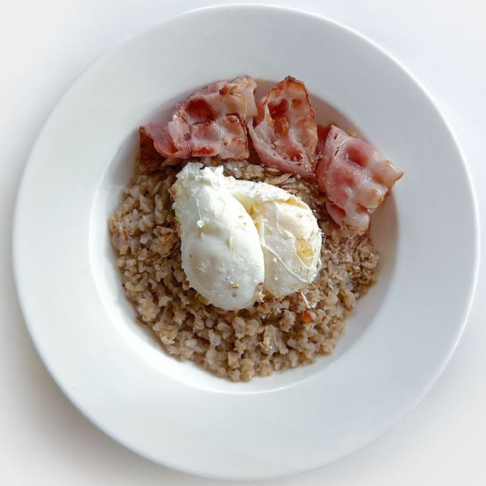 Заказать Каша гречневая, шампиньоны, бекон, пашот, пармезан, соус голландский, лук жареный.