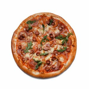 Заказать Тесто, сыр сливочный, сыр Моцарелла, ветчина, колбаски охотничьи, салями, томаты, шампиньоны, соус, орегано.