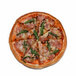 Заказать Тесто, сыр сливочный, сыр Моцарелла, ветчина, шампиньоны, соус, орегано.