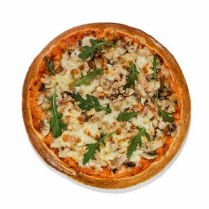 Заказать Тесто, сыр сливочный, сыр Моцарелла, ветчина, колбаски охотничьи, салями, томаты, шампиньоны, соус, орегано.