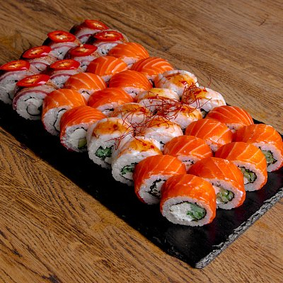 Заказать Креветка со сладким чили (Креветка, сыр творожный, грибы шиитаке, рис, водоросли нори, сладкий чили, черный кунжут). Филадельфия классическая (Лосось, сыр творожный, огурец, рис, водоросли нори). Запечённый снежный краб (Краб(имитация), огурец, сыр творожный, сыр моцарелла, рис, водоросли нори, соус терияки, белый кунжут).