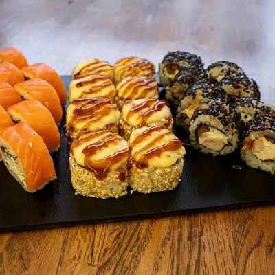 Заказать Креветка со сладким чили (Креветка, сыр творожный, грибы шиитаке, рис, водоросли нори, сладкий чили, черный кунжут). Филадельфия классическая (Лосось, сыр творожный, огурец, рис, водоросли нори). Запечённый снежный краб (Краб(имитация), огурец, сыр творожный, сыр моцарелла, рис, водоросли нори, соус терияки, белый кунжут).