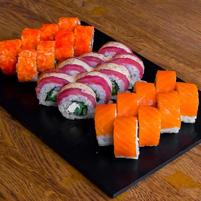 Заказать Филадельфия классическая (Лосось, сыр творожный, огурец, рис, водоросли нори). Калифорния (Креветка, икра тобико, огурец, рис, водоросли нори). Филадельфия в тунце (Тунец, сыр творожный, огурец, рис, водоросли нори, соус кунжутный).