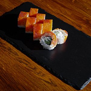 Заказать Лосось, тунец, сыр творожный, огурец, соус сладкий чили, рис, водоросли нори.