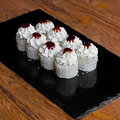 Заказать Крабовая паста микс, огурец, сыр творожный, рис, водоросли нори, кунжут белый, соус терияки.