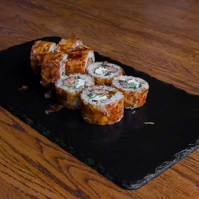 Заказать Лосось терияки, сыр творожный, огурец, рис, водоросли нори, стружка тунца.