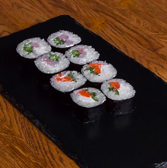 Заказать Лосось, креветка, сыр творожный, огурец, рис, водоросли нори.