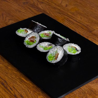 Заказать Креветка, бекон, сыр творожный, лук зелёный , рис, водоросли нори, соус терияки.