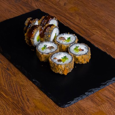Заказать Тунец, сыр творожный, огурец, такуан, рис, водоросли нори, соус терияки, сухари панко.