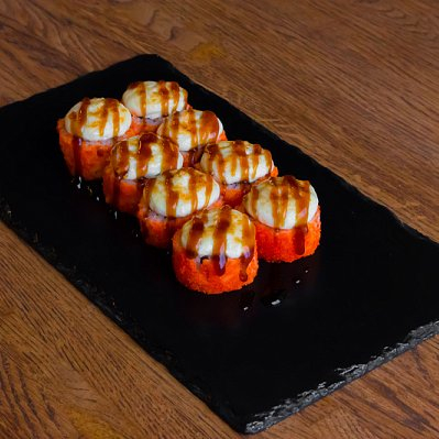 Заказать Креветка, тобика, огурец, рис, водоросли нори, сырная шапка, соус терияки.