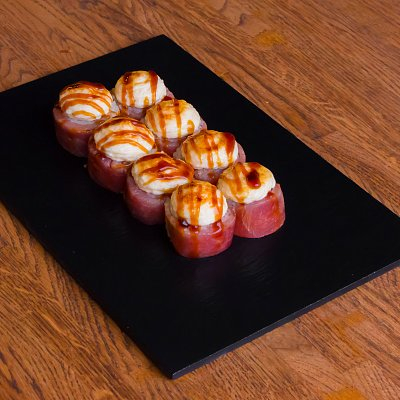 Заказать Тунец, сыр творожный, огурец, рис, водоросли нори, сырная шапка, соус терияки, соус кунжутный.